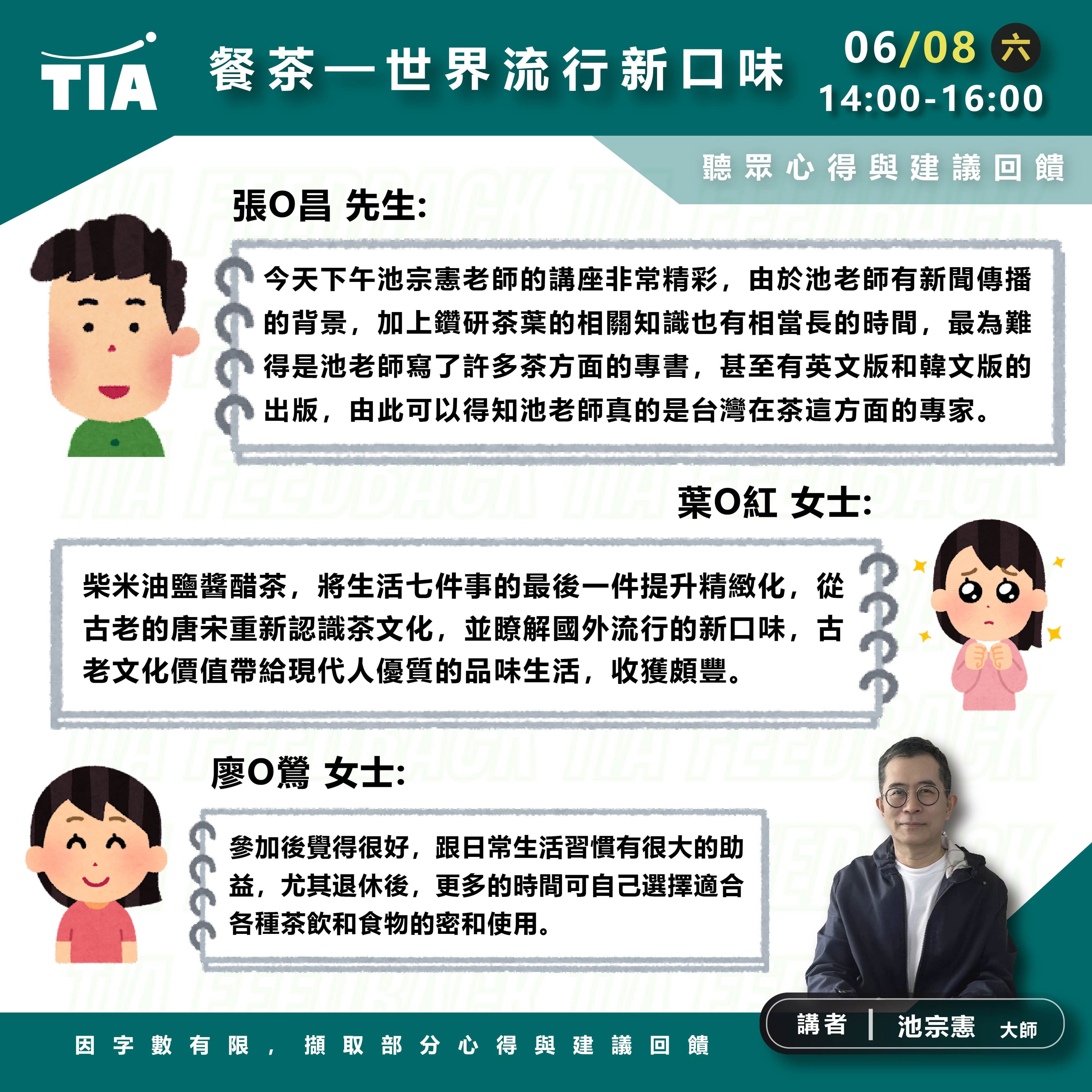 池老師不只研究茶葉和茶相關的器物,聽他演講中提到中國在宋朝就對茶道有相當的研究,宋徽宗尤其樂好此道,還留有一本專書,前半段演講講許多茶的歷史,後半段就提到茶和餐點如何搭配,很像西方吃飯配什麼酒類似,其中的學問真的很深,如果不花點 時間去了解,真的只是聽聽皮毛還是不了解其中的奧妙,任何專業知識都是需要花時間學習,感謝池老師今天精闢扼要的精彩演講,讓個人對茶有更深一層的了解。"
