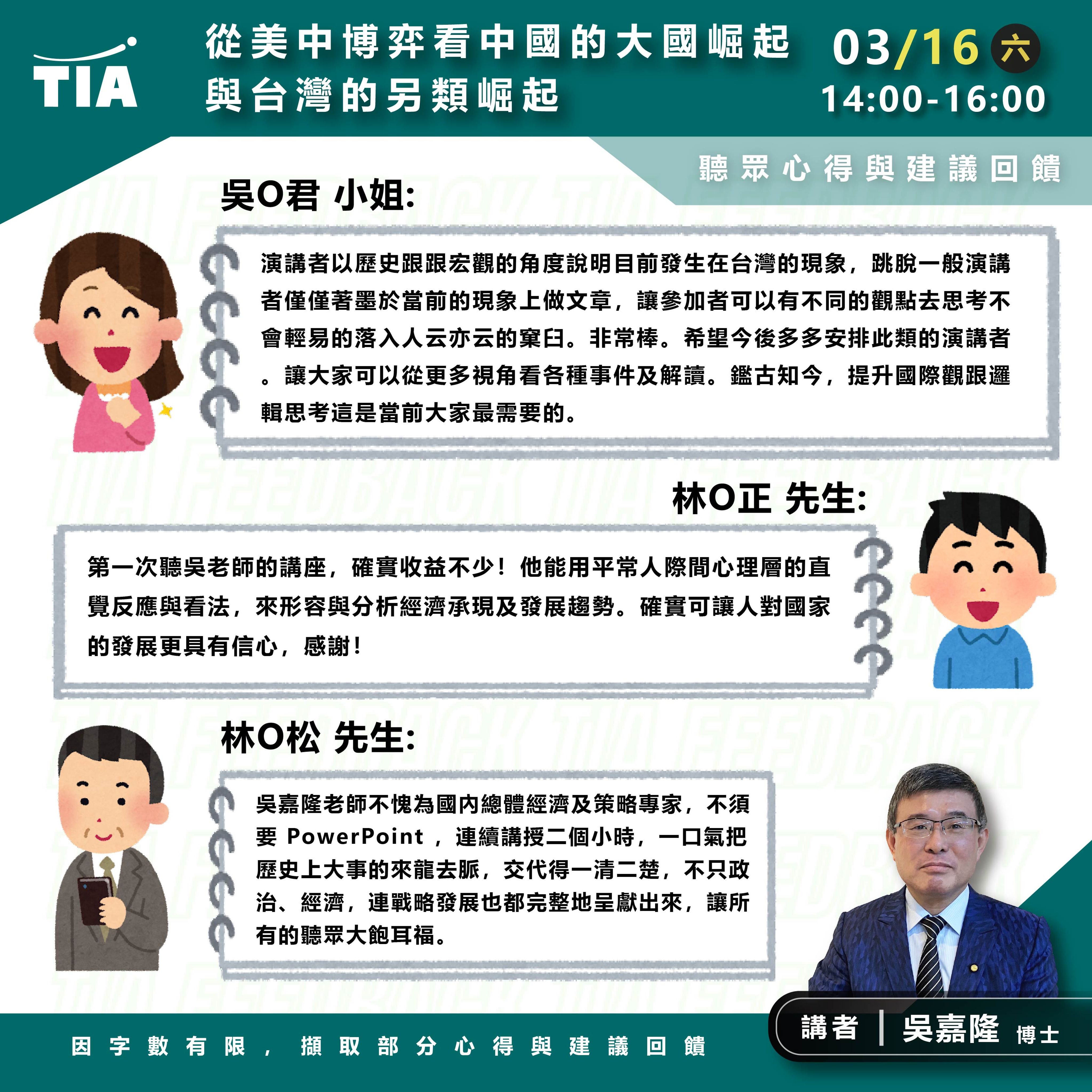 "演講者以歷史跟跟宏觀的角度說 明目前發生在台灣的現象,跳脫一般演講者僅僅著墨於當前的現象上做文章,讓參加者可以有不同的觀點去思考不會輕易的落入人云亦云的窠臼。