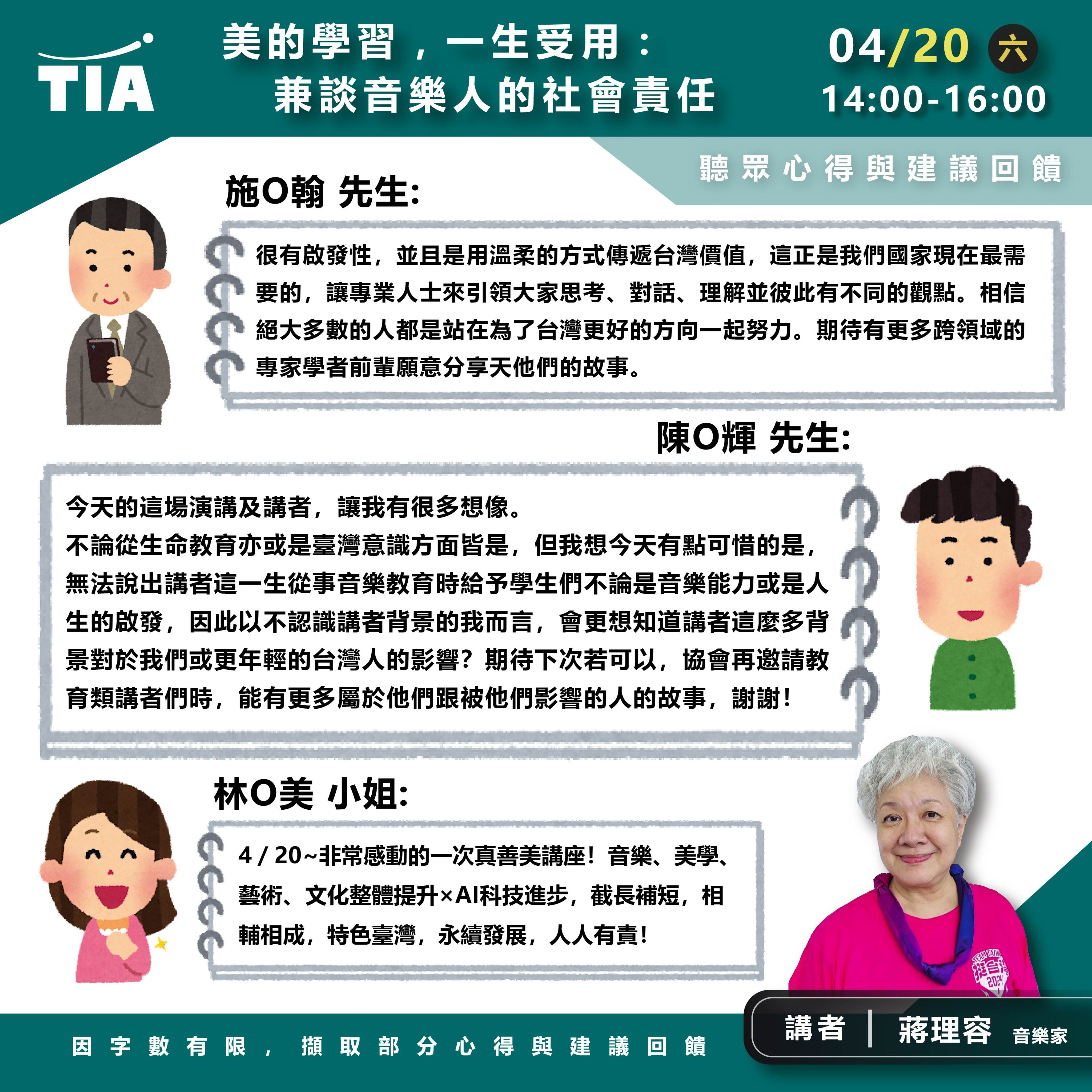不論從生命教育亦或是臺灣意識方面皆是,但我想今天有點可惜的是,無法說出講者這一生從事音樂教育時給予學生們不論是音樂能力或是人生的啟發,因此以不 認識講者背景的我而言,會更想知道講者這麼多背景對於我們或更年輕的台灣人的影響?