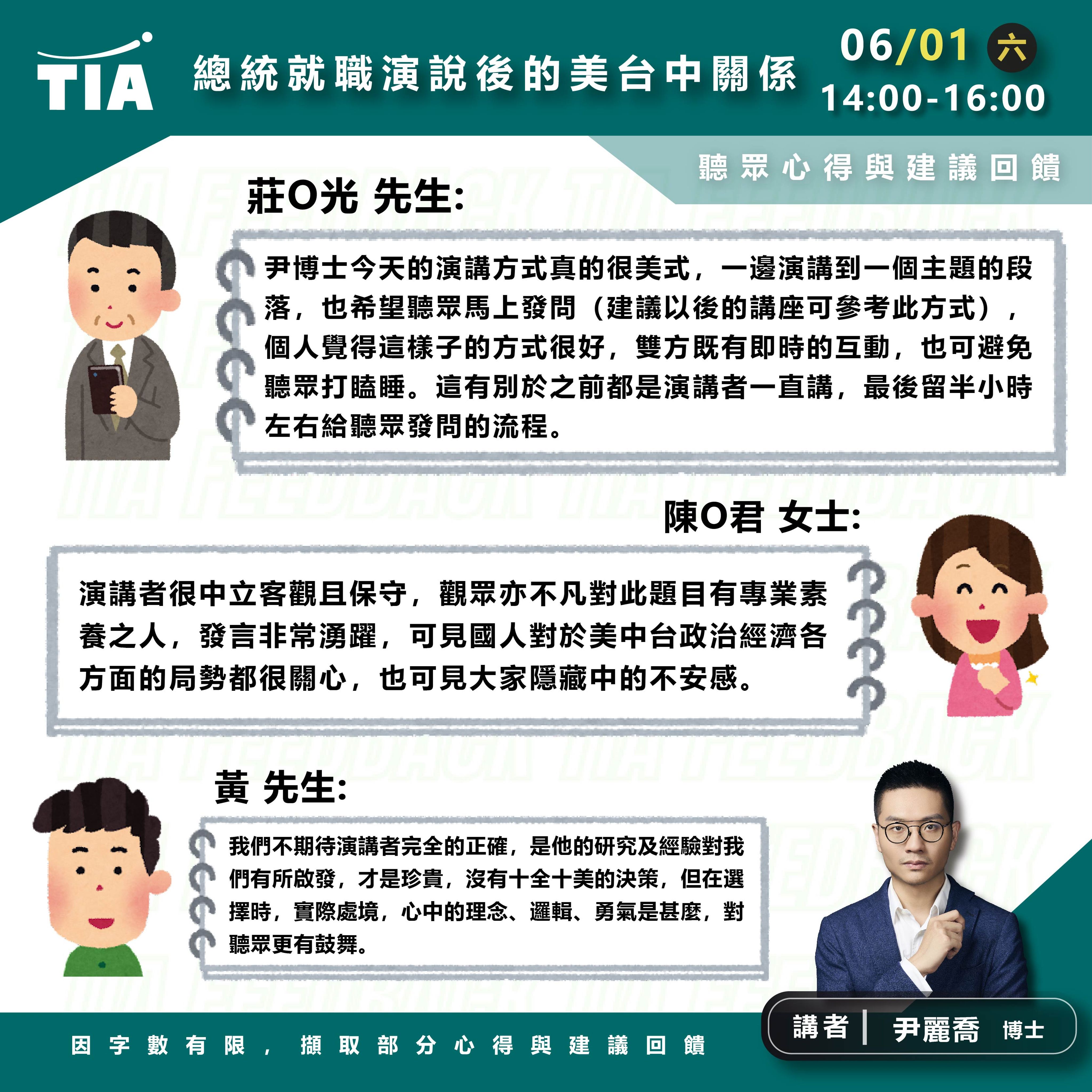 演講者很中立客觀且保守 觀眾亦不凡對此題目有專業素養之人 發言非常湧躍 可見國人對於美中台政治經濟各方面的局勢都很關心也可見大家隱藏中的不安感