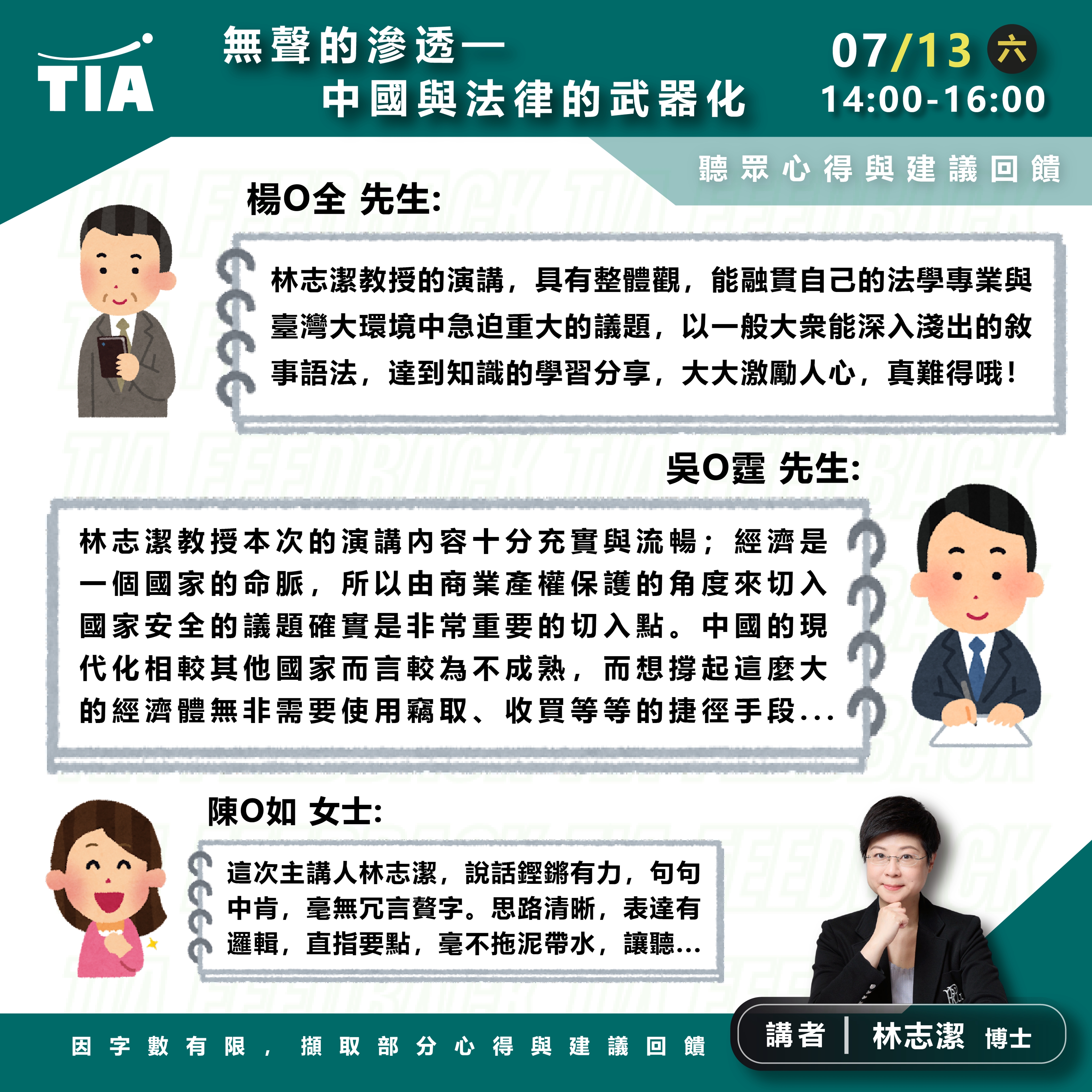 "林志潔老師的演講淺顯易懂又生動,很清楚可以了解中國對台灣滲透的方式與案例,現在更是法律戰,我目前擔心的是社會文化與宗教的滲透,這種滲透讓中間選民、藍白支持者不設防,不著痕跡,以為不痛不癢,交流沒什麼問題,可是,他們不知道的是這些文化交流單位是屬於中共統戰部底下的組織。除了滲透台灣,我相信大部分的人不知道中國也正滲透全世界。