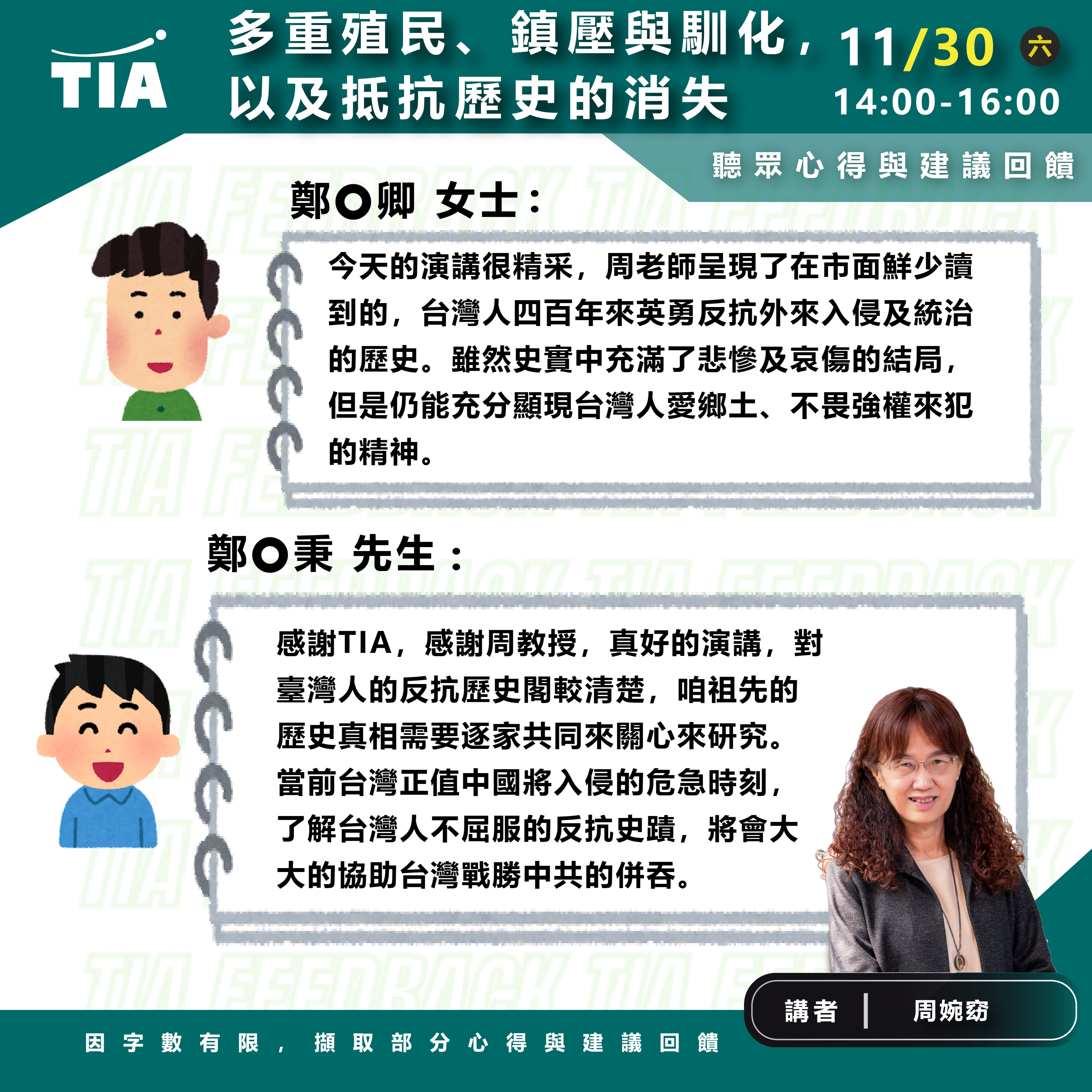 所以今天TIA的演講非常難得。如果可以,建議能將這個反抗史推廣擴大,讓更多台灣人知道我們英勇的傳統 。"