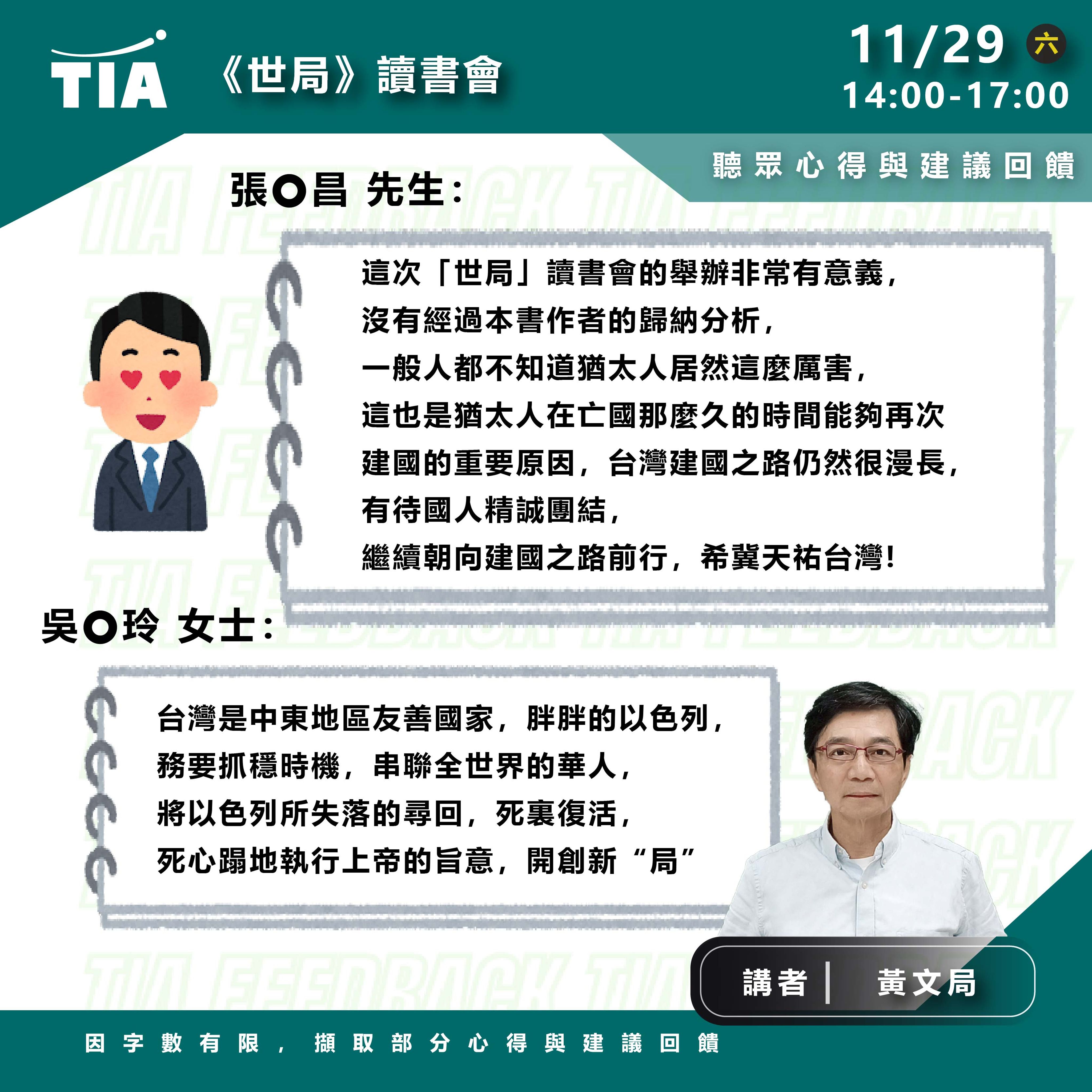這次「世局」讀書會的舉辦非常有意義,因為黃創辦人也是本書作者親自分享本書的內容,大約一個小時15分鐘的時間,精要的把本書關於猶太人的歷史和猶太人優秀的表現,以及在商業上的成就作說明,沒有經過本書作者的歸納分析,一般人都不知道猶太人居然這麼厲害,這也是猶太人在亡國那麼久的時間能夠再次建國的重要原因,當然能夠建國成功,國際社會的幫助和二戰後的時間點也是重要因素,我們台灣從二戰到現今已經過了八十年,我們仍然沒有建國成功,在許多國際組織仍然無法加入,台灣建國之路仍然很漫長,有待國人精誠團結,繼續朝向建國之路前行,希冀天祐台灣!