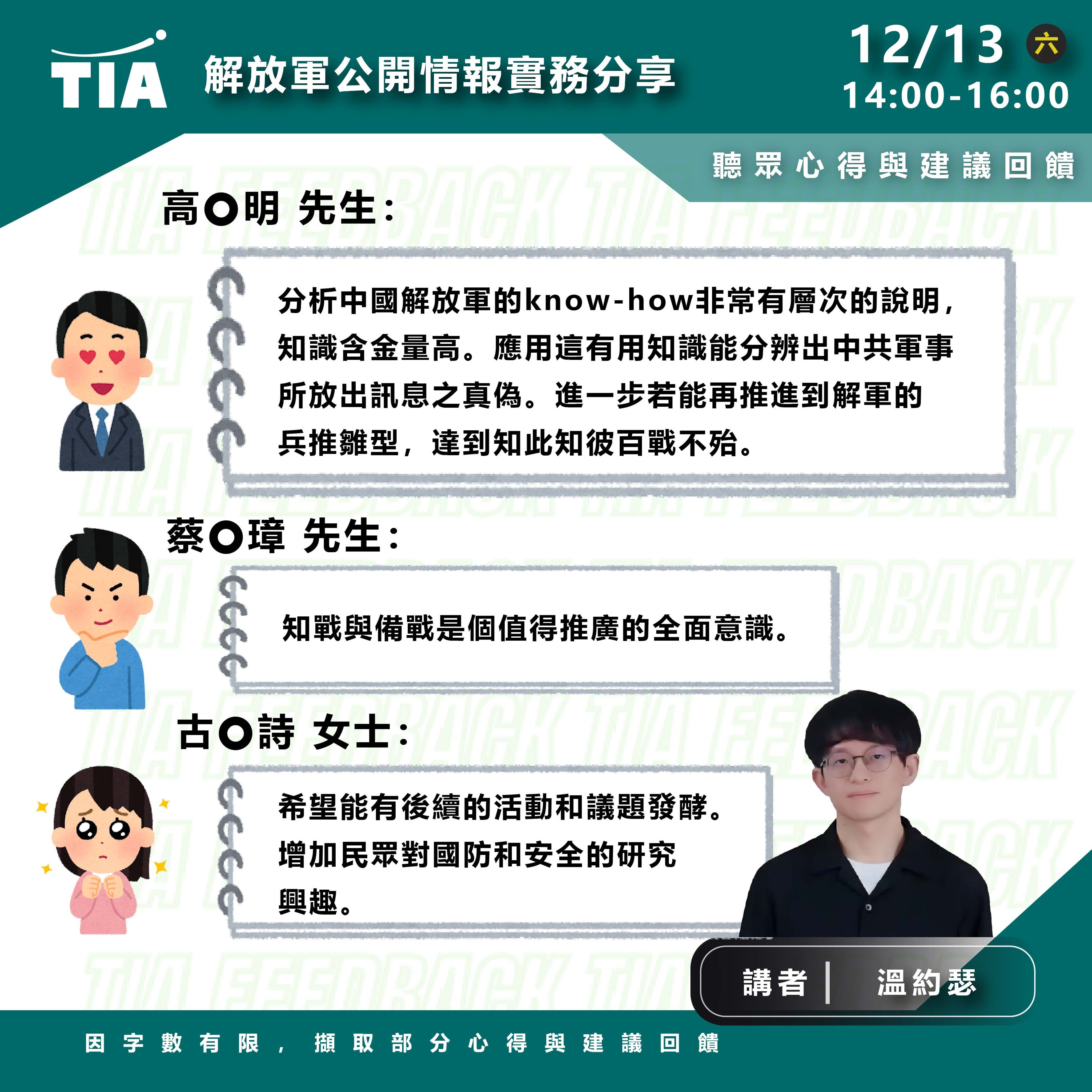 希望能有後續的活動和議題發酵。增加民眾對國防和安全的研究興趣。